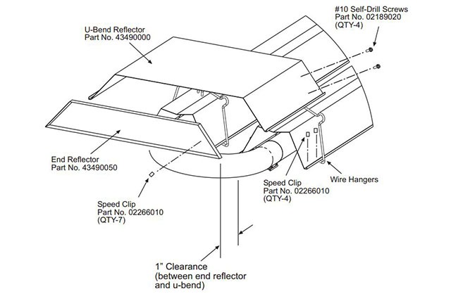 $26.25U-Bend Reflector Kit designed to cover the end of the U-tube and reduce the clearance to combustibles above the heaters from 18″ to 6″ for SIU series heaters ( includes 11 speed clips)